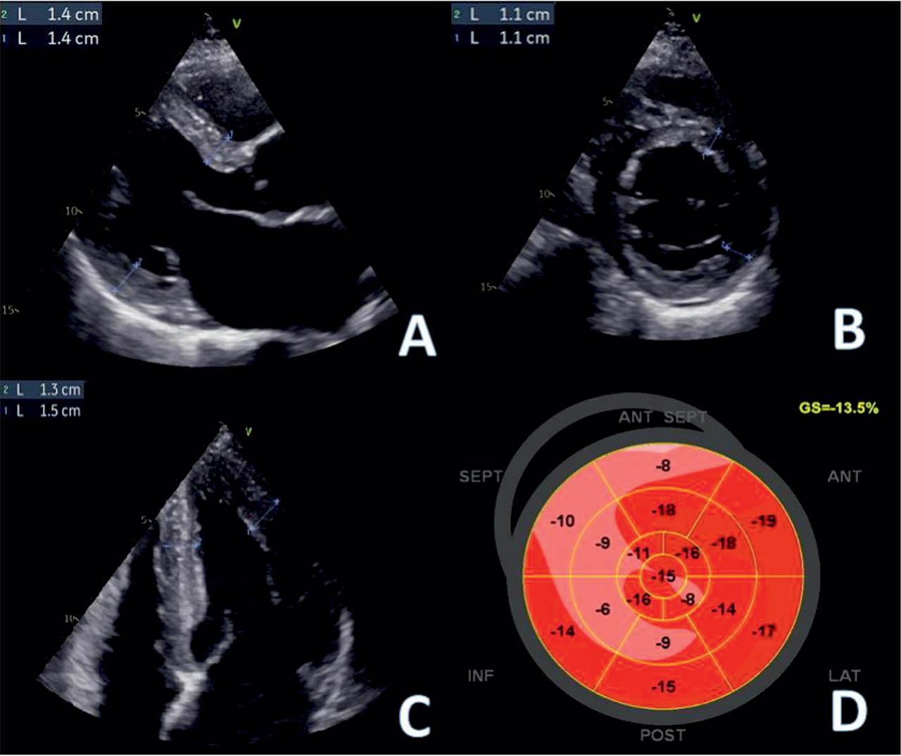 Transthoracic echocardiography. Basal anterior septum and posterior wall measurements in panels A. Parasternal long axis view (PLAX) and B. Parasternal short axis at mitral valve level (PSAX- MV). C. Apical four chamber view (A4C) measurements of apical inferior septum and anterolateral wall (maximum thickness 15 mm). D. Myocardial deformation imaging. Longitudinal strain bull’s eye plot showing a reduced global longitudinal strain (−13.5%) with lowest segmental values in septal and inferior segments.