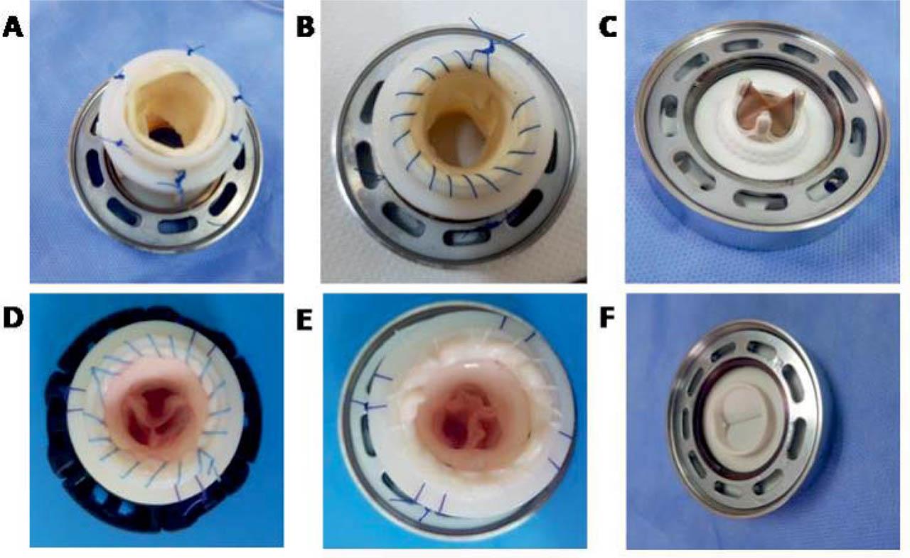 Tested valvular models – A – Decellularized porcine aortic valve; B – Decellularized porcine pulmonary valve; C- Biological prosthesis; D – Fresh porcine aortic valve; E – Fresh porcine pulmonary valve; F – mechanical valve.