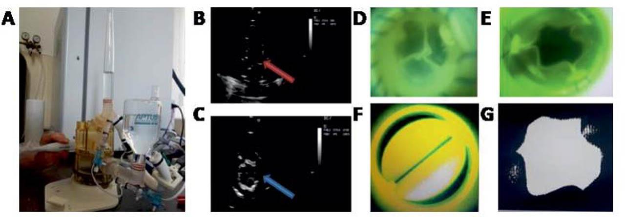 Ultrasound and photographic examination – A – general aspects of the heart valve bioreactor for pulmonary conditions and transversal plane technique, the ultrasound probe is marked in green; B – ultrasound aspect of longitudinal plane examination – the leaflets are marked with the red arrow; C- ultrasound view of transversal plane examination – the central coaptation of cusps is marked with the blue arrow. D – Snapshot of a decellularized porcine aortic valve; E – Snapshot of a biological prosthesis; F – Picture editing of the mechanical prosthesis used to calculate the opening area; G – Software evaluation of the opening are of a biological prosthesis.