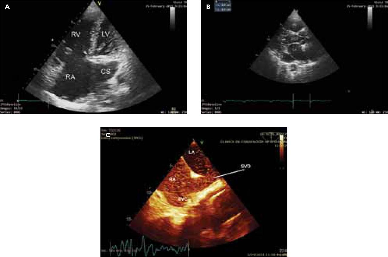 Anomalous pulmonary venous return (APVR) can also be discovered incidentally in adults with right heart dilation and CS dilation3,10. The CS dilates when is associated a PLSVC, which generally draines into the CS. Patients with total anomalous pulmonary venous connection associates a patent foramen ovale or an ASD to allow flow of blood drained to the right heart to move into the systemic circulation, and 16% of all these patients have a connection to the CS10. However, in our patient, CT angiography ruled out such an association.