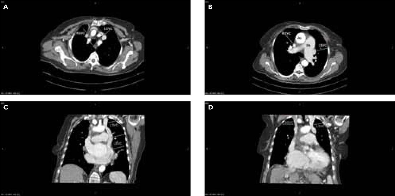 A. Thoracic CT angiography, axial section, mediastinal view shows RSVC and LSVC with a communicating vein of 8 mm (CV) between the sternum and great vessels (green arrows). B. Thoracic CT angiography, axial section, mediastinal view: dilated main, right and left PA, aorta (Ao), LSVC between Ao and LPA, the RSVC in normal position (green arrows). C. Thoracic CT angiography coronal section, mediastinal view: brachiocephalic trunk continues with persistent LSVC (22/18 mm – AP/T) which descends lateral from the aortic arch, LPA, LA and anterior from left inferior pulmonary vein (green arrows), joining the CS which is grossly dilated in calibre and draining into RA. D. Thoracic CT angiography coronal section, mediastinal view: RSVC draining in the RA, partially visible LSVC (green arrows).