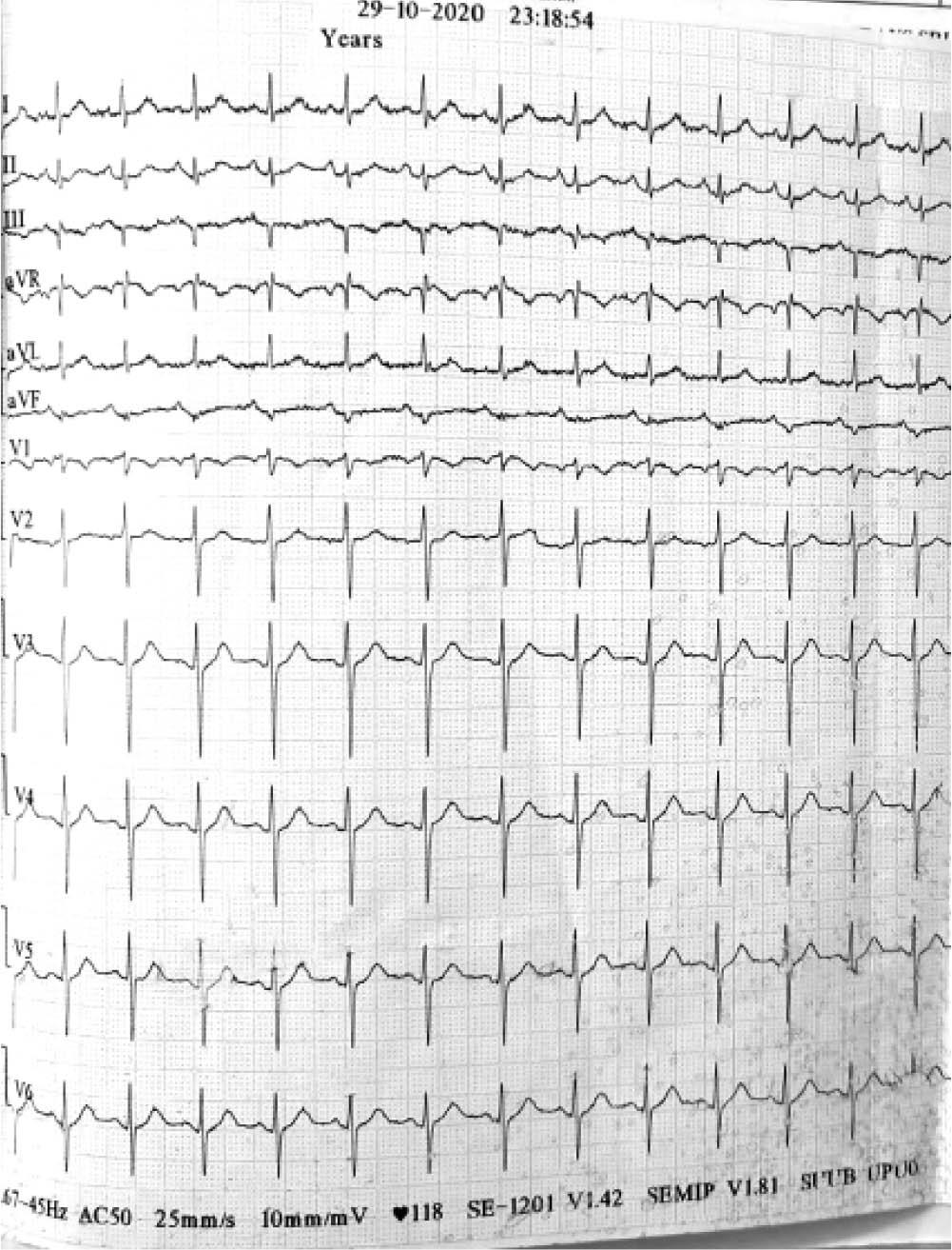 The electrocardiogram (EKG) showed sinus tachycardia, normal QRS complex and no specific ST-T wave abnormalities (Figure 1).