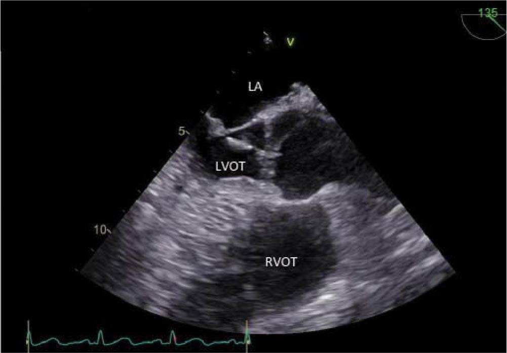 Transesophageal echocardiography midesophageal 5 chamber view -a significantly reduced aortic vegetation (6 mm). LA left atrium, RA right atrium, LVOT left ventricle outflow tract, RVOT right ventricle outflow tract, LV left ventricle, Ao ascending aorta.