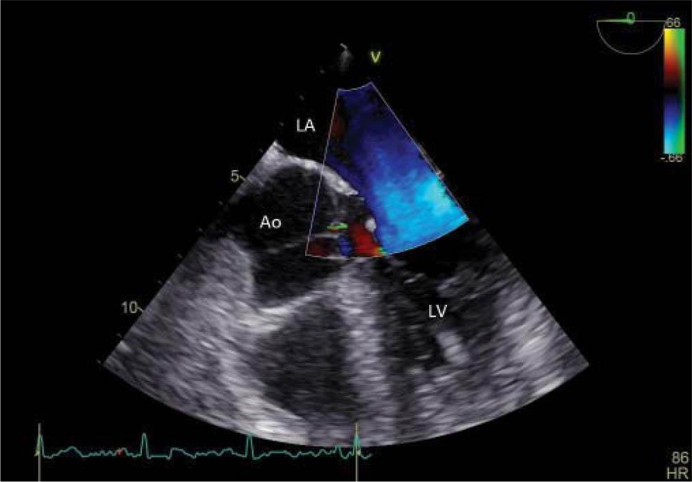 Transesophageal echocardiographymidesophageal 5 chamber view-perforation cusp without hemodynamic impact is revealed by colour Doppler examination.
