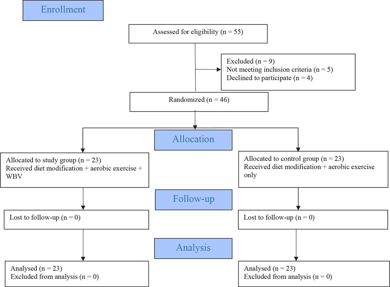 The study group participants underwent a protocol consisting of diet modifications + aerobic exercise + WBV. The control group underwent diet modifications + aerobic exercise only.