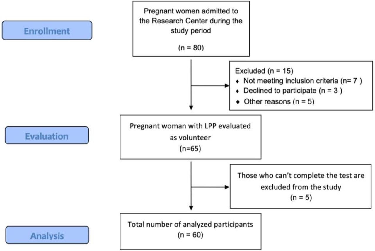 This cross-sectional, descriptive study was conducted at Uskudar University Physiotherapy and Rehabilitation Research Center; an online environment option was also available for participants who chose not to visit a center due to the COVID-19 pandemic. Of the 65 pregnant women with LPP contacted within the research center, 60 participants were accepted to the study. Based on Cohen’s effect size coefficients, assuming an expected effect size (d = 0.5), the minimum sample size was determined as 60 when the power was calculated as 0.8.