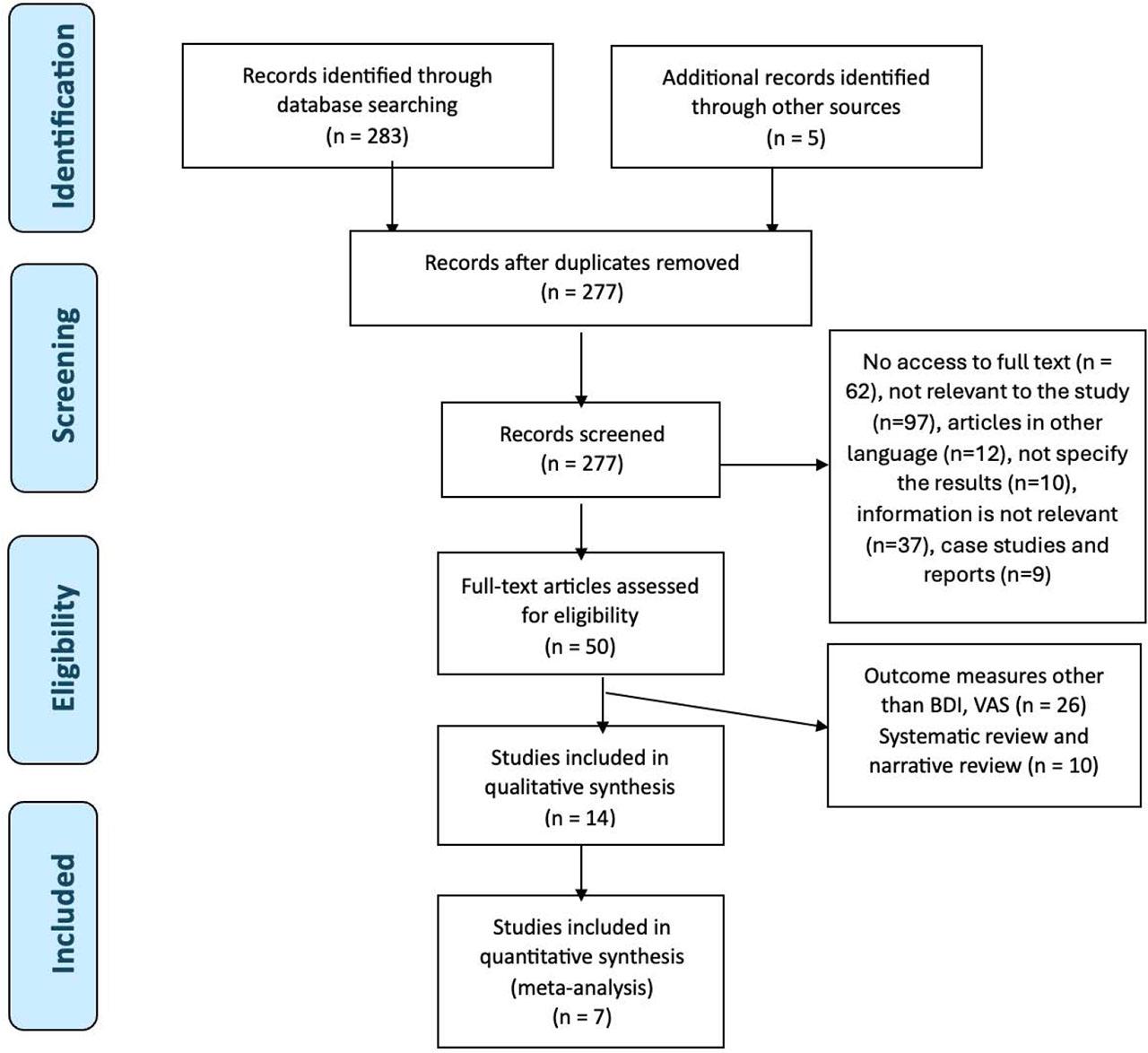 The study reviewed randomised controlled trials (RCTs), non-randomised controlled trials, pre-post experimental studies, and randomized clinical trials published during the period 2013–2023. Papers including different groups, different outcome measures other than VAS and BDI and interventions other than physiotherapy were excluded.