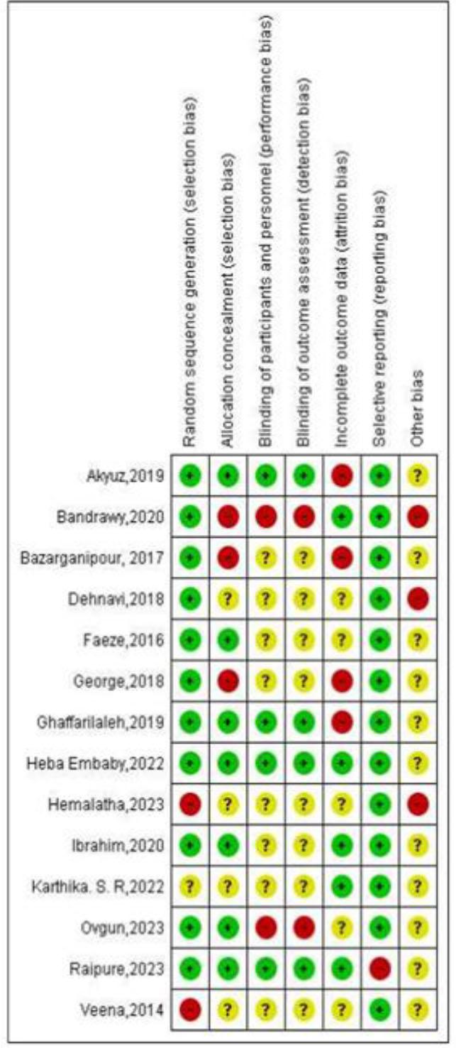 The risk of bias for the included randomized controlled trials is depicted in Figure 2. Out of the 14 studies included, 11 had random sequence generation, but two did not [17, 20]. Allocation concealment was performed in seven studies, but not in three [4,5,16]. Four studies demonstrated blinding of participants and outcome assessors, whereas two did not [1, 4]. Additionally, four studies had incomplete outcome data [5,6,13,16], and only one showed performance bias [7].