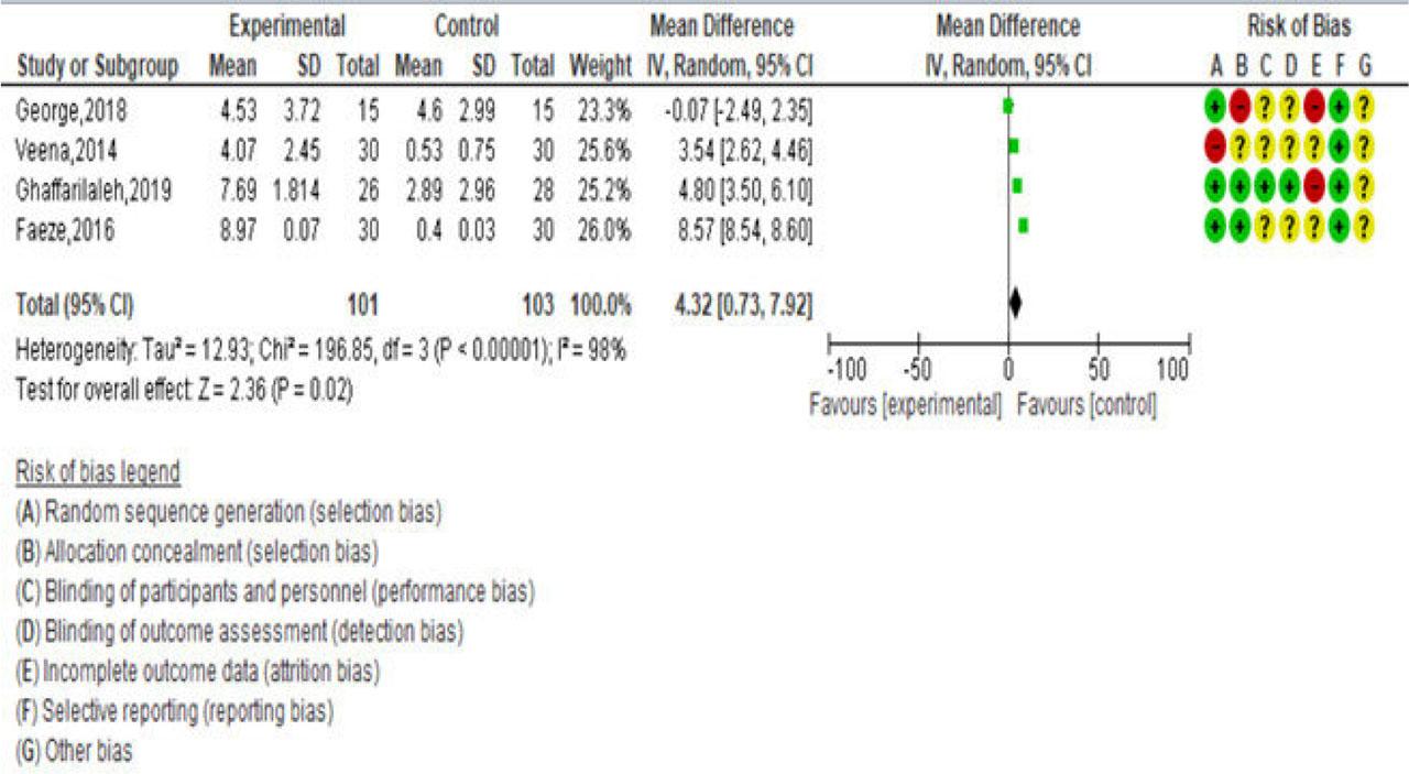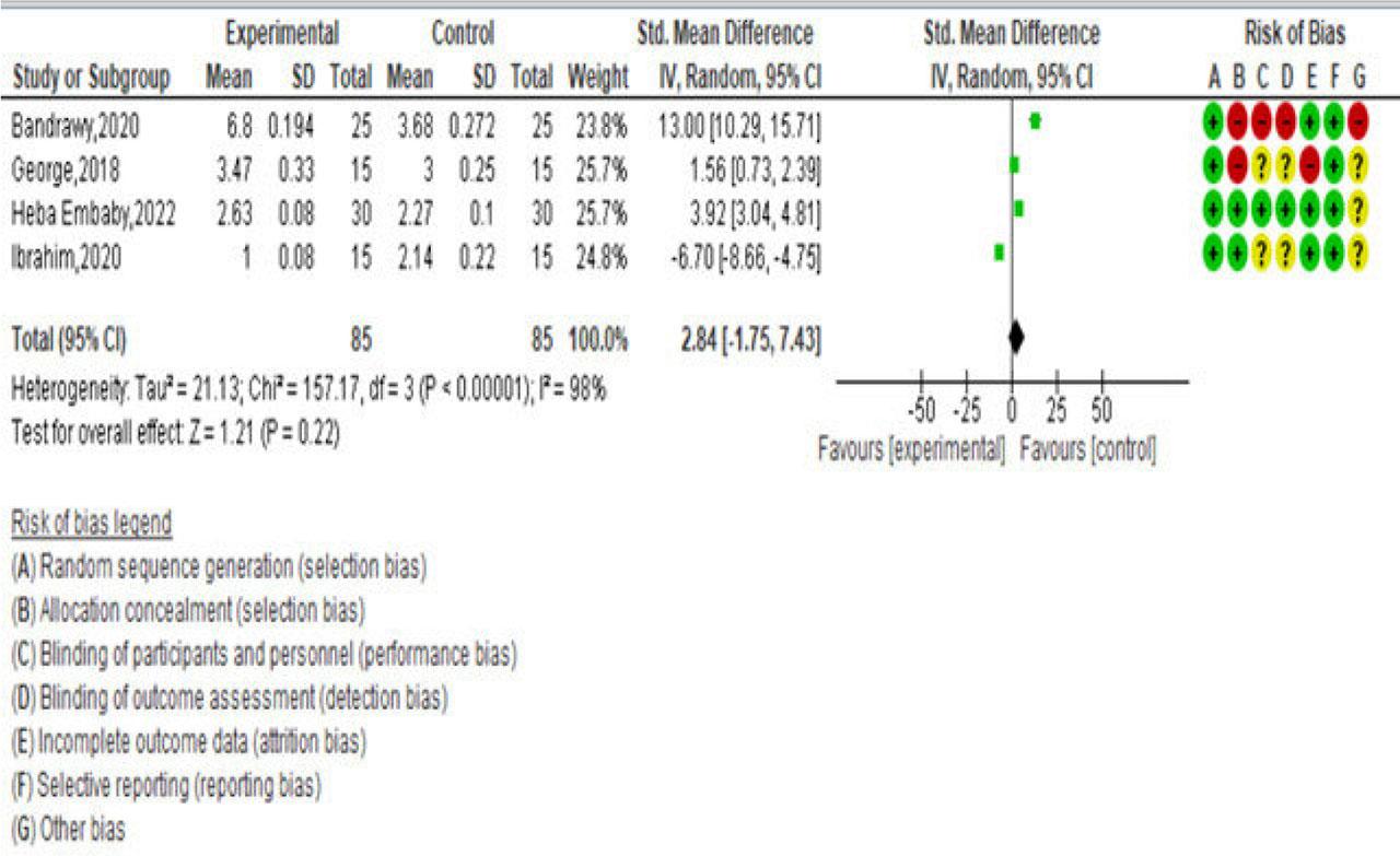 Statistical analysis was conducted using Review Manager 5.4.1 software. Effect size was calculated using post-intervention means and standard deviations. Outcome allocation concealment was analysed using the standardized mean difference with a 95% confidence interval. Clinically comparable results were aggregated using a meta-analysis utilizing the random-effects model. In studies where meta-analysis was not possible, narrative synthesis was used.