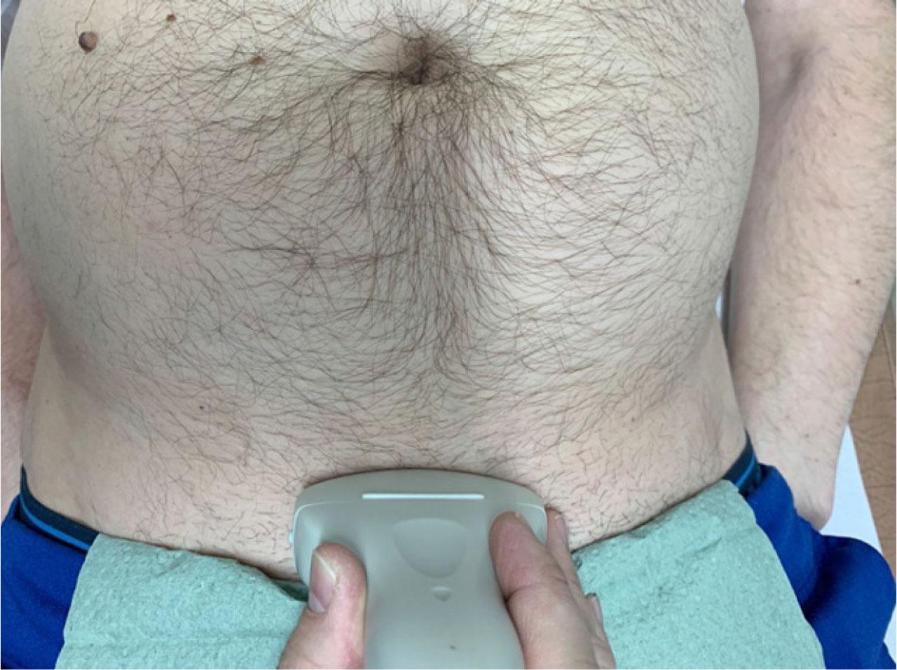 Standard examination of pelvic floor function was performed by ultrasound imaging: a Mindray Z5 Portable Ultrasound System was used with convex array transducer operating at a frequency of 3.5 to 5 MHz. During the examination, the patient was placed on a couch in a supine position with the knees slightly flexed, feet in a neutral position, and upper limbs parallel to the torso. This position was intended to relax the muscles of the anteromedial area of the abdomen. Following the application of ultrasound gel, the convex array transducer was set transversely to the median line of the abdomen just above the pubic symphysis and pointed in a posteroinferior direction towards the bladder. The point of application of the ultrasound transducer is shown in Figure 1.