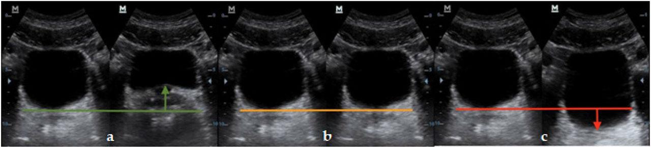 The patients who underwent the examination were asked to contract and release their pelvic floor muscles before the examination. During the examination, the patient performed multiple trial attempts at contracting and releasing the pelvic floor muscles while the ultrasound array transducer was moved to obtain the highest possible quality image. This approach made it possible to assess the position of the pelvic floor during contraction. Correct muscle function was indicated by elevation of the pelvic floor muscles during volitional contraction (Figure 2a); conversely, a lack of reaction to the contraction, or depression, was assessed as incorrect function (Figure 2b and 2c, respectively).
