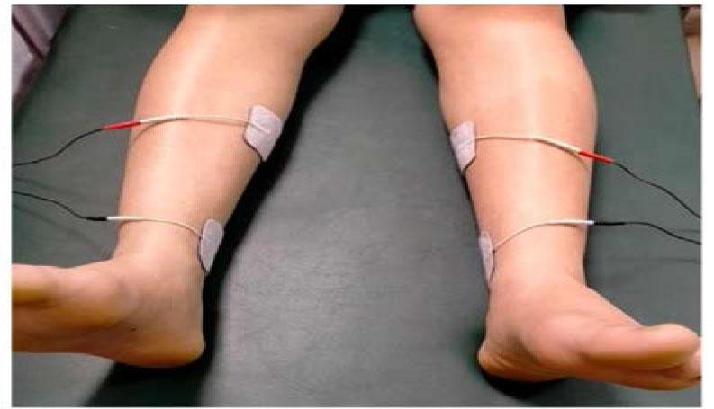 The transcutaneous nerve was stimulated using an EV-906 device (Taiwan) was used in continuous mode for 30 minutes with a 10 Hz frequency and 200 μs pulse duration. Self-adhesive surface-stimulating electrodes were used for stimulation on both lower limbs. The negative electrode was positioned behind and above the medial malleolus, and the positive electrode was positioned 10 cm above the negative one (Figure 1). The intensity was steadily increased until a tingling feeling was experienced in the foot, or planter flexion of the ipsilateral toes. The intensity was modified according to the comfort level of the patient. The stimulation was performed in the morning, immediately after breakfast [7,11].
