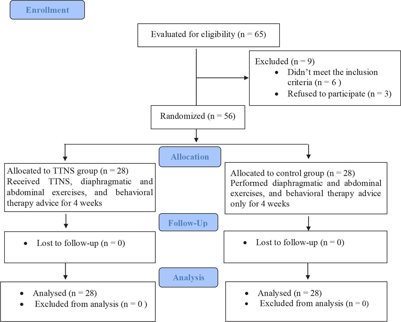 In each session, the patients in the TTNS group received bilateral TTNS for 30 minutes, as well as breathing exercises, abdominal muscle training, and behavioral therapy advice. In contrast, patients in the control group received breathing and abdominal exercises with behavioral therapy advice, with no TTNS. All treatment interventions were administered by a physiotherapist with five years experience, three times weekly for four weeks, with the first session commencing in the first week following delivery [3]. No adverse effects were noted throughout the treatment for any participant in either group.