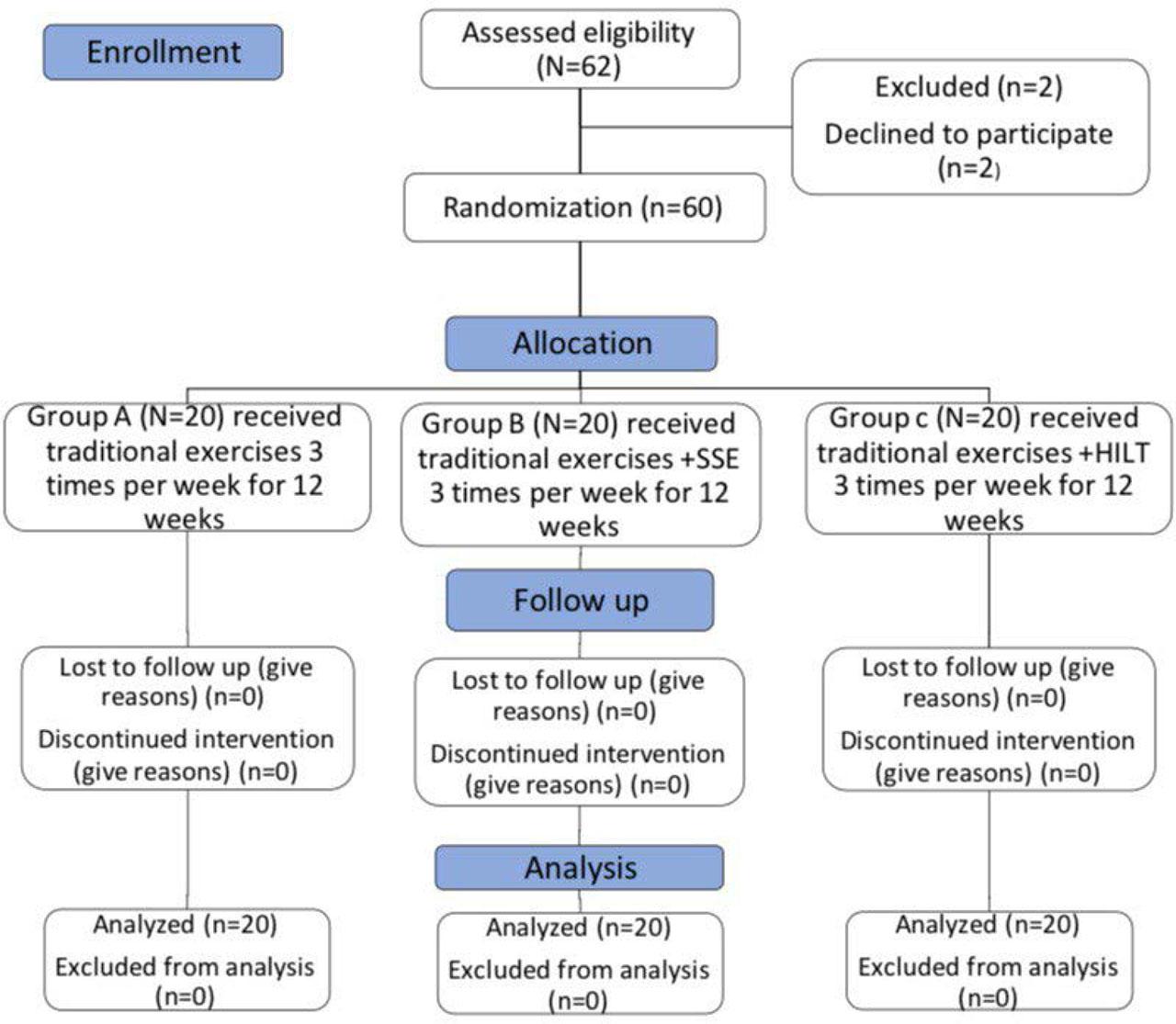 The participants were assigned into three equal-sized groups at random. Group A performed traditional exercises, Group B performed traditional exercises along with SSE, and Group C performed traditional exercises along with HILT. Each group exercised three times weekly for 12 weeks (Figure 1).