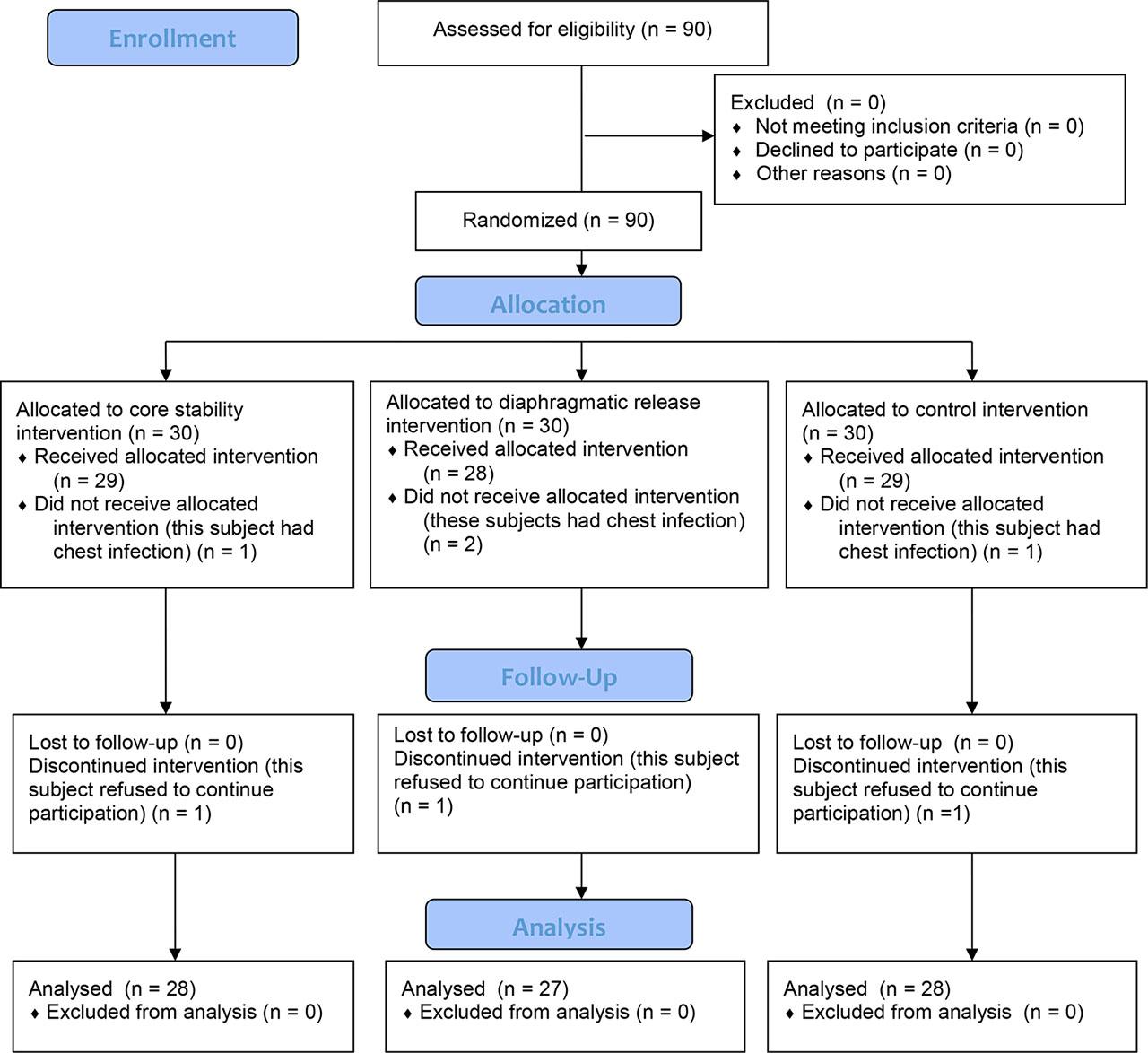 | Core stability Group (n = 28) | Diaphragmatic Release Group (n = 27) | Control Group (n = 28) | Test value | p-value | |