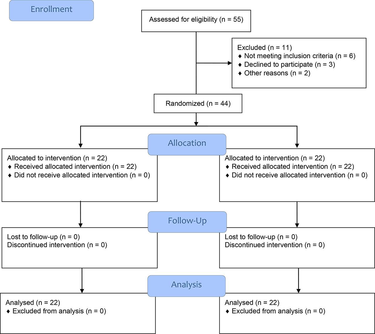 The sample size was determined using balance, as outlined in Kim27, with 80% power at an α level of 0.05, including two measurements for two groups and an effect size of 0.47; the calculation used F-test MANOVA for repeated measures within and between interactions. It was found that the minimum necessary sample size was 38 participants, with an additional 6 (15%) people accounted for as potential dropouts, resulting in a total sample size of 44 participants, i.e. 22 in each group. The sample size was determined utilizing G*Power software (version 3.0.10).