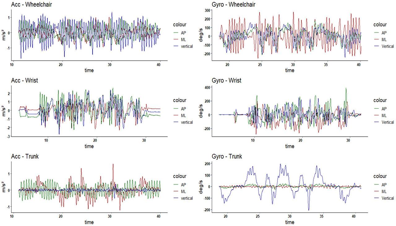 | Median linear acceleration of the wheelchair in the mediolateral direction | − 0.86 | 0.00 * |