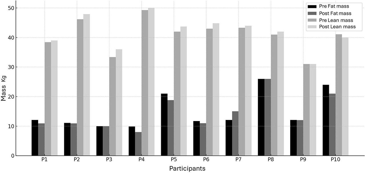 | Lean Mass (kg) | 40.9 ± 5.5 | 41.8 ± 6.6 | 0.04* |