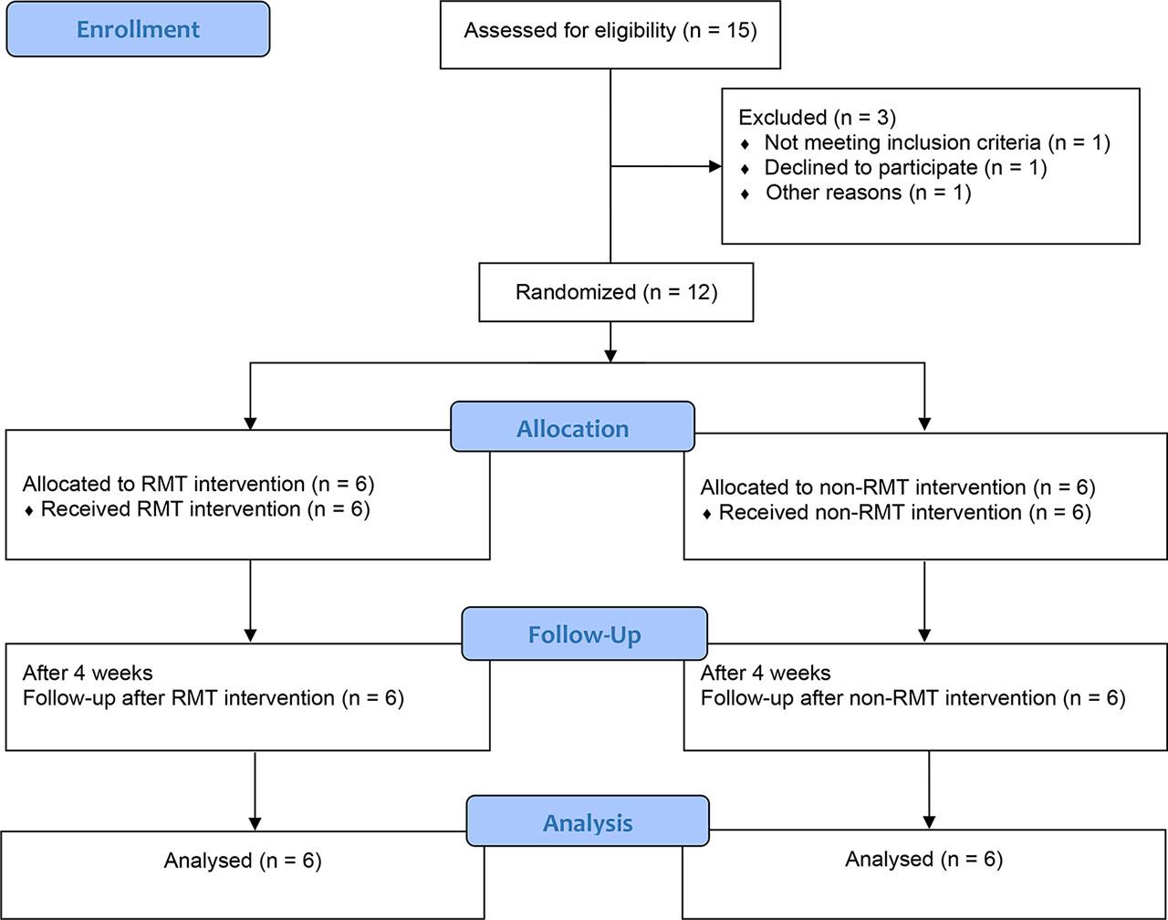The participant recruitment, allocation, follow-up and analysis stages are presented in a CONSORT flow chart (Figure 1). The athletes were recruited from wheelchair sports training centres associated with Lovely Professional University and from institutions linked to national wheelchair sports federations in Punjab, India. Recruitment was facilitated through professional networks that distributed study invitations and information sheets to competitive wheelchair athletes. Eligible participants were athletes, aged between 25 and 42 years, diagnosed with SCI below the T1 neurological level, engaged in organized wheelchair sports (basketball, rugby, or racing) for at least one year, participating in regular, structured training within recognized sports settings. The athletes were excluded if they had experienced recent cardiorespiratory complications, progressive neurological conditions, history of poor compliance with rehabilitation programs or contraindications to RMT.