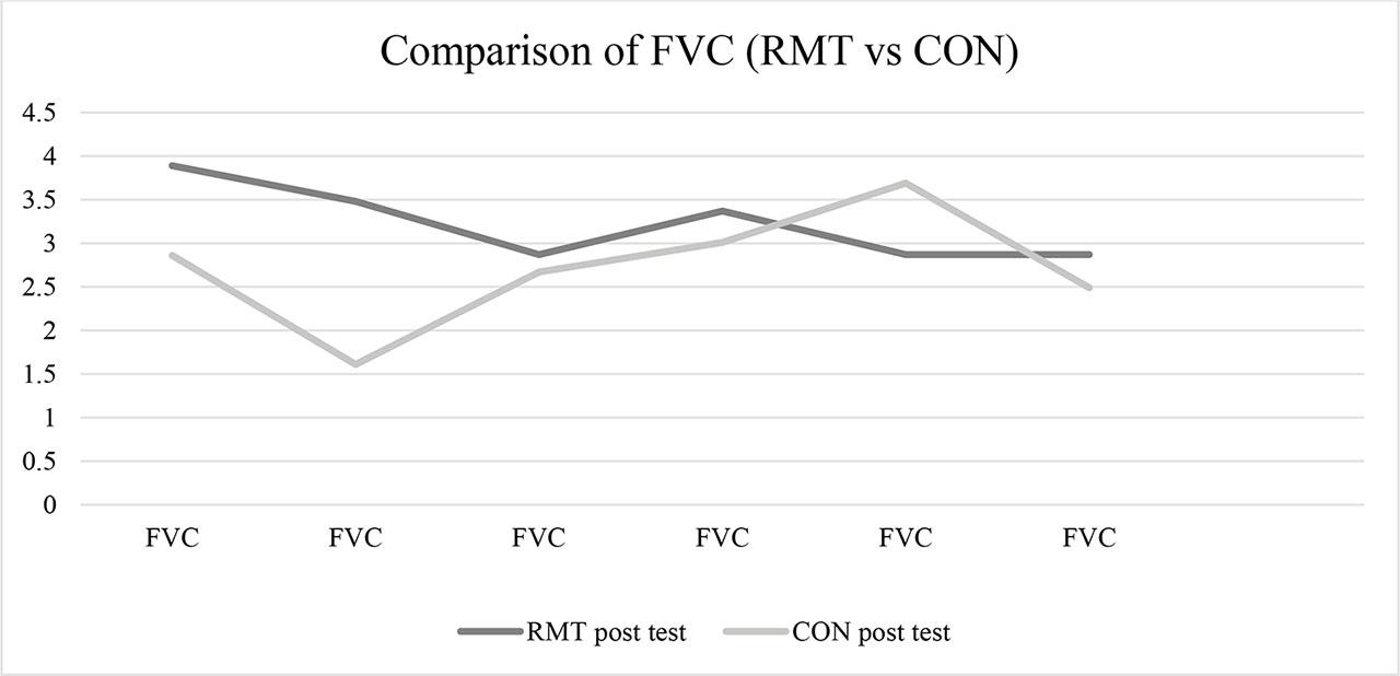 FVC: comparison between RMT and Control groups post-intervention (dark colour – RMT group, and light colour – control group)
