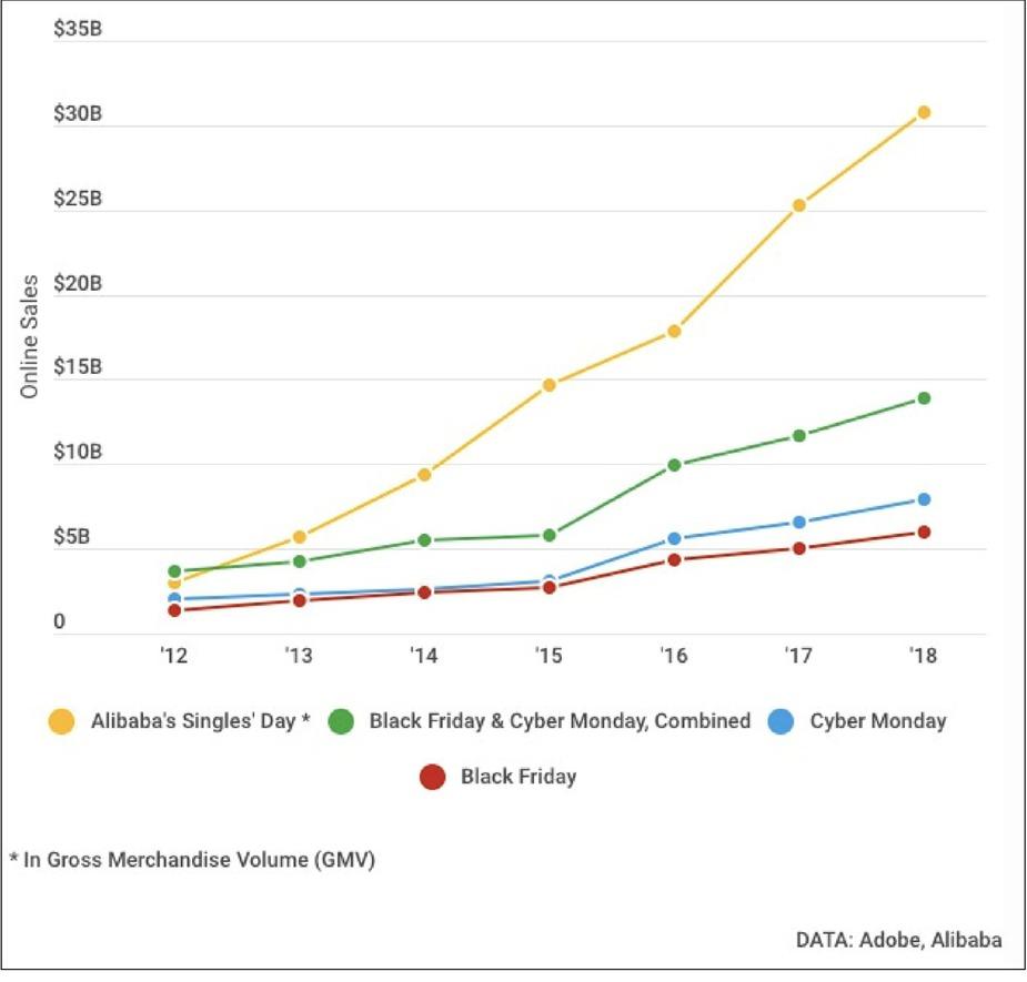 The total amount of online sales for Alibaba, Black Friday, Cyber Monday, 2012–2018. (Alibaba, 2019).