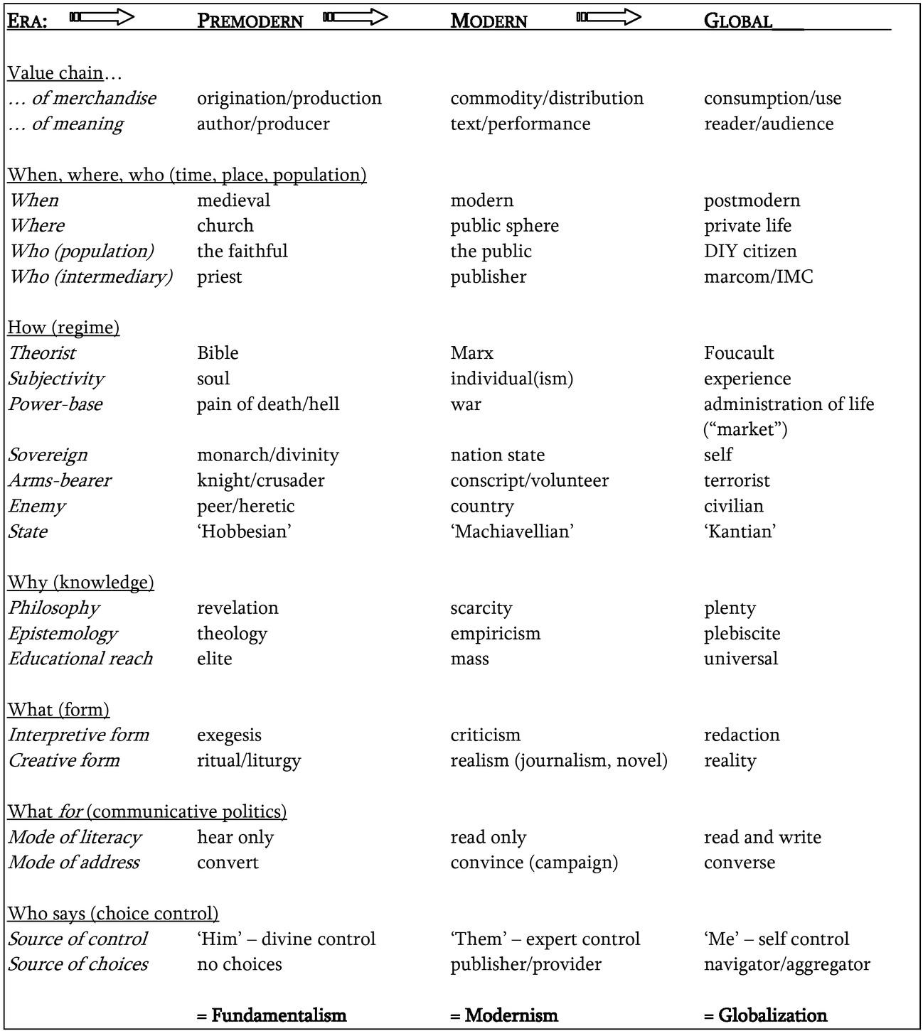 This was part of a more profound shift, where the modernist paradigm of realist representation as a whole was transforming. Excess of representation (postmodernism) was but a symptom of a general shift of productivity (semiotic and economic) further along the ‘value chain of meaning’ (Hartley 2008a). Productivity is manifested in the assumed source of meaning in any system, and this general shift can be observed across many domains and processes (see Fig. 1).