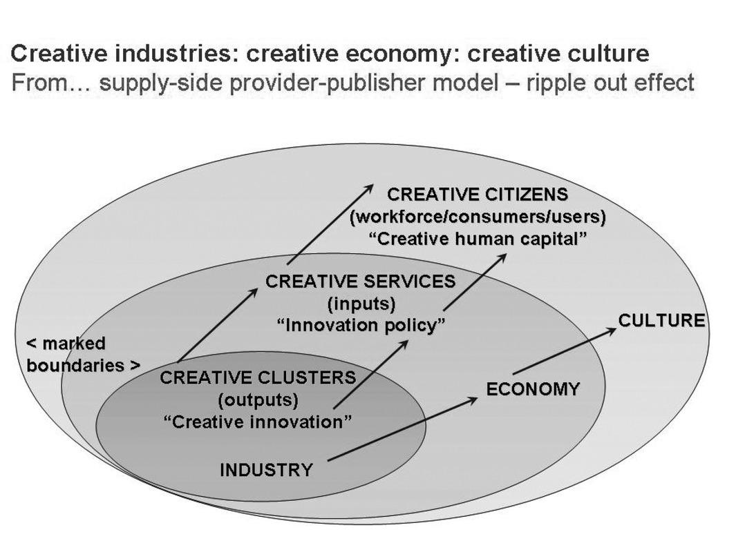 The place where this rethink seems to have progressed most energetically in recent years is in the new field of ‘creative industries’ (Hartley 2005; 2008b). The issues raised in the attempt to identify and explain the creative industries are of significance to cultural studies, because the creative industries are located at the very place where new values, both economic and cultural, new knowledge and new forms of social relationship are emergent (rather than ‘dominant’) and where they are in process of society-wide adoption and retention, often through market mechanisms. It may even be argued that the ‘creative industries’ are the empirical form taken by innovation in advanced knowledge-based economies, in which case their importance – like that of the media – exceeds their scale as a ‘sector’ of the economy. It extends to their role as a general enabling social technology. This would place creative innovation on a par with other ‘enabling social technologies’ like the law, science, and markets. Where the media (in the guise of ‘cultural industries’) were regarded as the social technology of ideological control in the modern industrial era, the creative industries may be regarded as the social technology of distributed innovation in the era of knowledge-based complex systems.