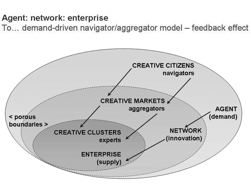 Instead of the industrial or modern-era model is now possible to propose a demand model of creativity in an evolutionary model of the economy. This sees creative culture in terms of the growth of knowledge among the entire population, not merely among industry or artistic experts. Instead of being the objects of causal sequence, consumers, users and citizens become its subject, navigating as agents, not being pushed around as passive effects, thus: