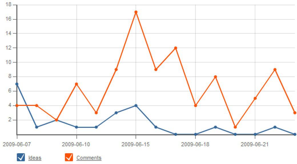 Figure 1 also shows that posting of ideas started high at the commencement of the event but tailed off over time – this is a very typical pattern for idea contribution held over a multi-day period. However it is worth noting that in this case the communications programme was sufficiently effective to cause a small spike in new ideas posted on 15-06-09. It is typically very difficult to achieve this spike in idea contributions in the second week of a jam.