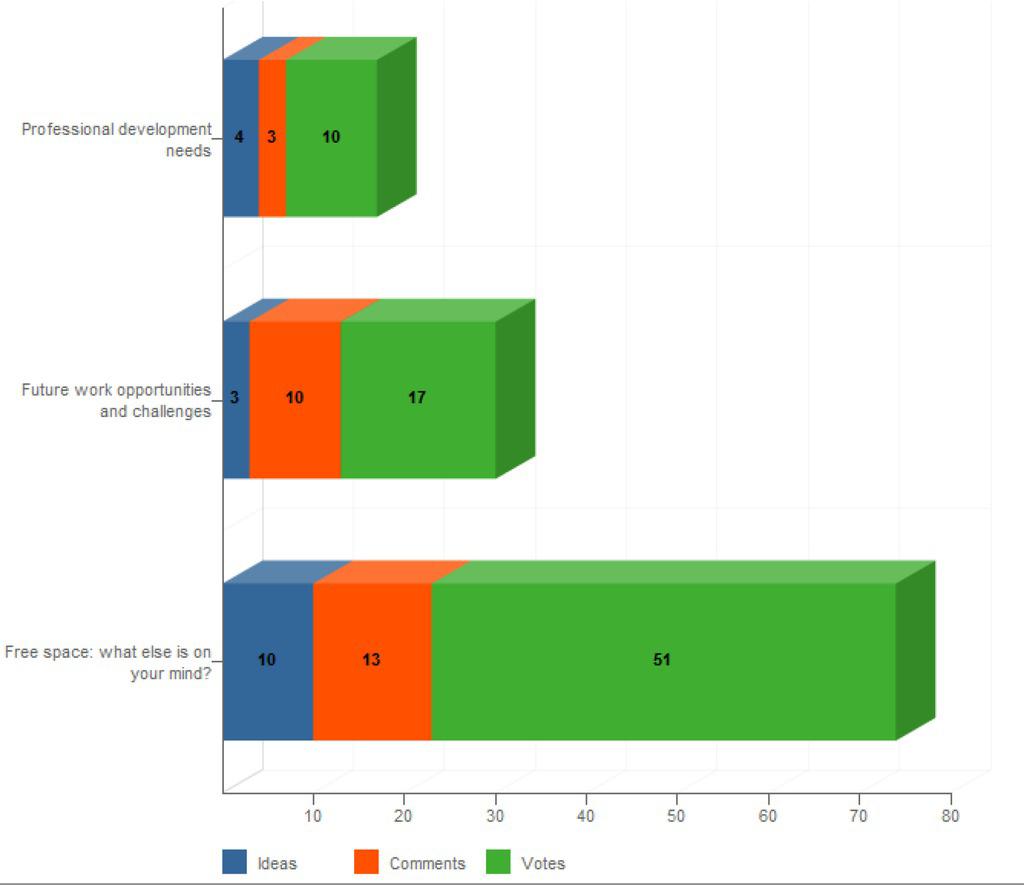 The „future work opportunities and challenges‟ and „free space‟ themes clearly captured the most activity in terms of ideas, comments and votes. It is interesting to note that no ideas – and therefore no comments or votes – were posted against the theme related to the Centre‟s interdisciplinary research agenda. This indicates that this particular theme may have been mismatched with the actual concerns of the RHD community.