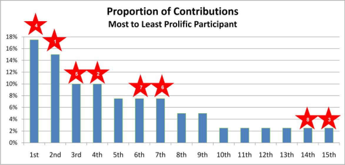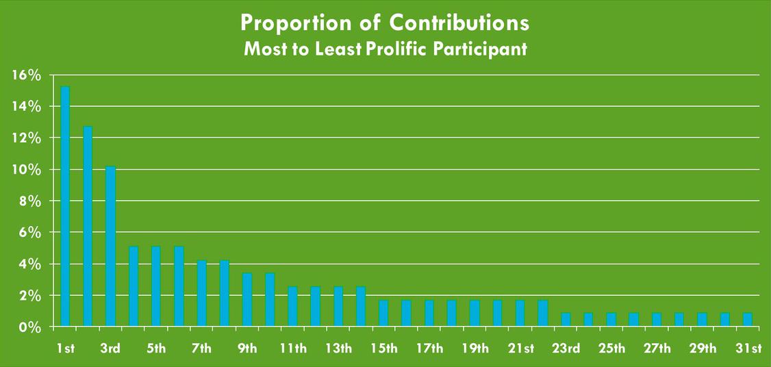 In the CCi Mainstreaming Challenge, the top 3 individual contributors (in terms of the number of comments and ideas submitted) contributed just under 40% of the total ideas and comments generated by the jam. This is illustrated in Figure 9 below.