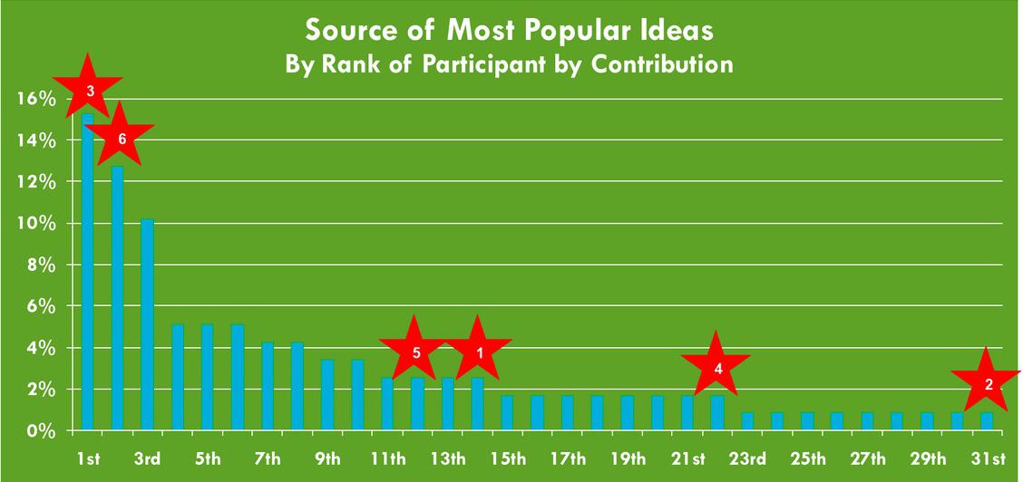 The concentration of popular ideas in the long tail of the distribution shows that the jam provides an effective mechanism for capturing valuable ideas from individuals who are relatively less prolific in their contributions compared to others. For example, the second most popular idea in the CCi Mainstreaming Challenge was submitted by one of the least prolific contributors in the event.