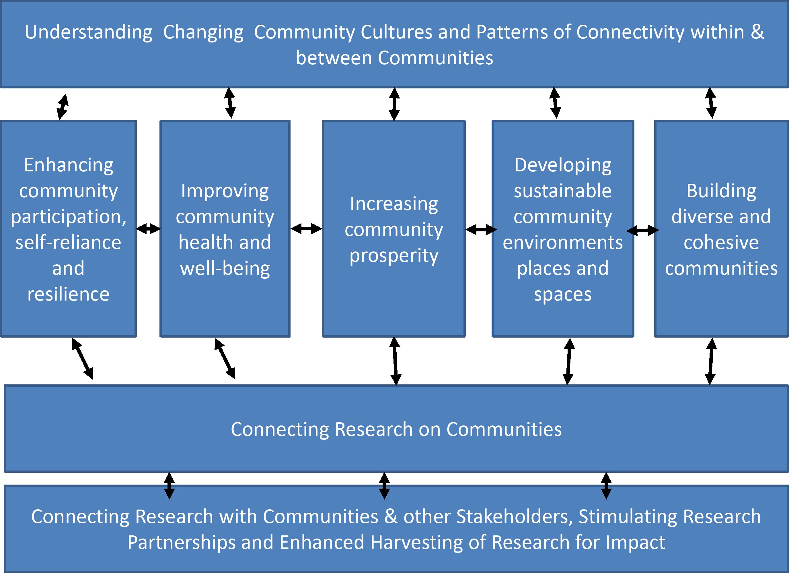 To mobilise the potential for increasingly connected communities to enhance self-prosperity, sustainability, health & well-better connecting research, stakeholders communities.