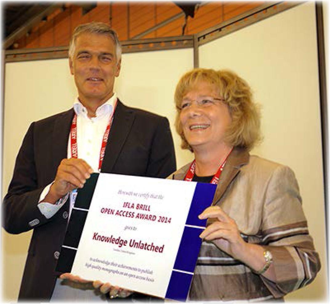 Left: Frances Pinter received the IFLA/Brill Open Access Award 2014 from Brill’s Executive Vice-President Finance and Operations, Perry Moree.