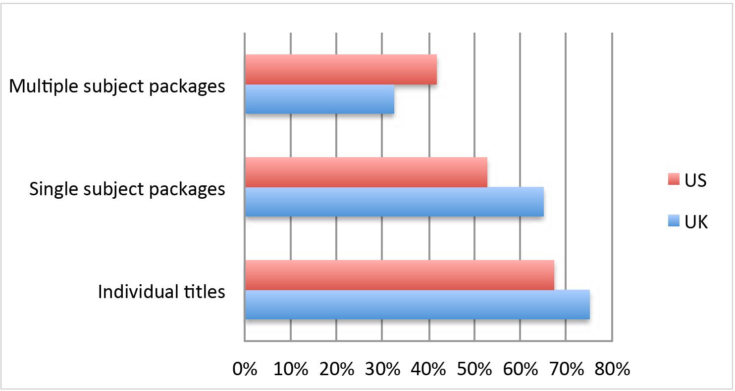 The survey helped the project team to identify the kinds of books and the size of the collection that libraries were most likely to support during the Pilot. A preference for single titles and single subject packages was evident in responses from UK libraries, compared to institutions in North America.
