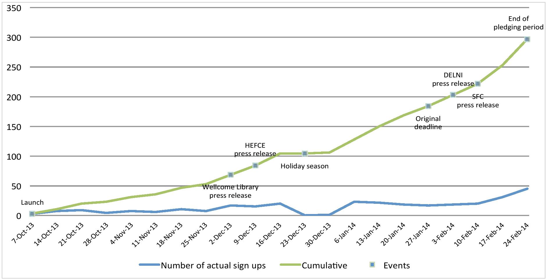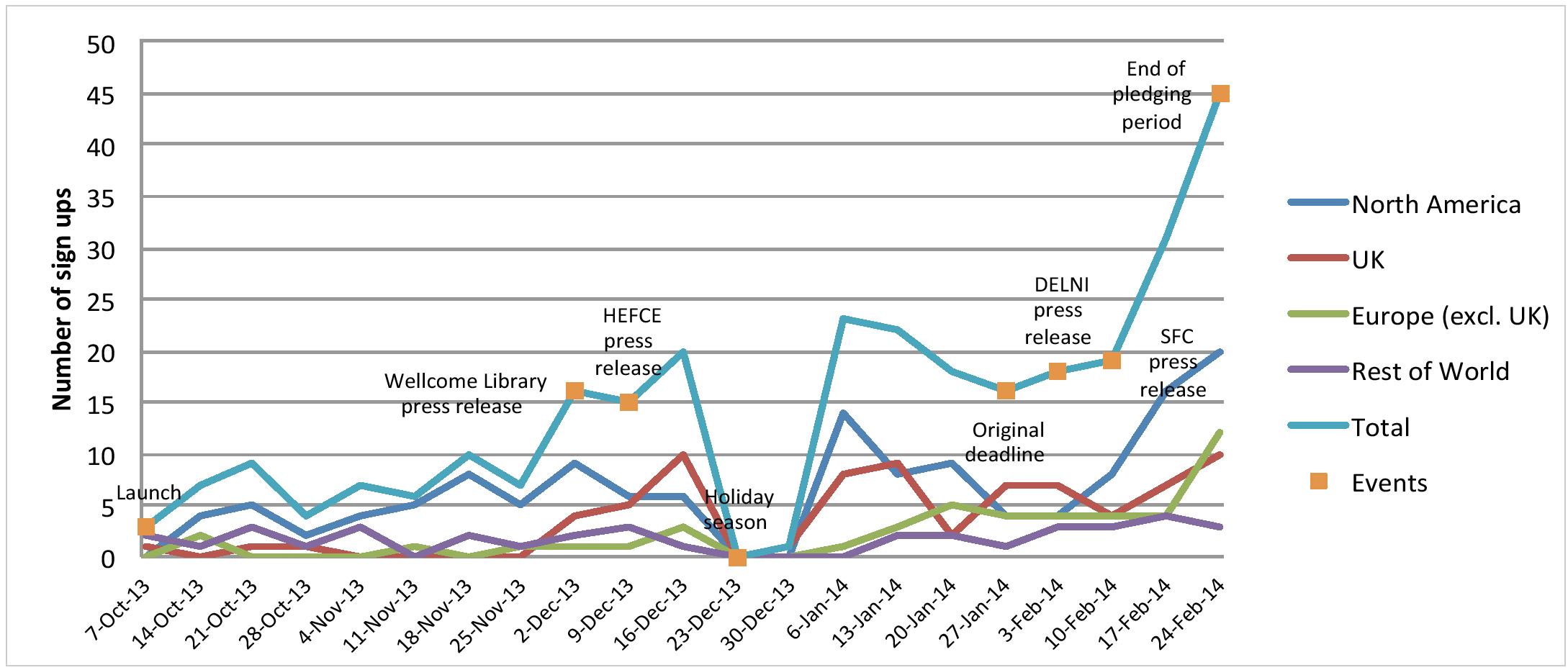 During the pledging period, which lasted from October 2013 until February 2014, 297 libraries from 24 countries signed up for the Pilot Collection, exceeding the original target for library participation by almost 50%. Each unlatched book was uploaded onto the OAPEN and HathiTrust platforms as its publisher provided it to KU. The first unlatched book became available via the OAPEN Digital Library on 11 March 2014, followed shortly after by HathiTrust. Because the Pilot dealt with new and forthcoming titles, rather than backlists, some of the books in the Collection were not published until the second half of 2014.