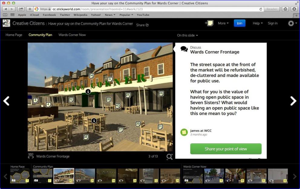 The Wards Corner Stickyworld was designed by two members of the coalition - one of the key people maintaining the website interested in design and new technologies, and the architectural designer of the plan - with support from the research team and the Stickyworld team. The content emphasised key dimensions of the community plan, focusing on heritage, arts and culture, community activities and local economy. For the WCC the tool offered an innovative and visual way to facilitate community-led planning: