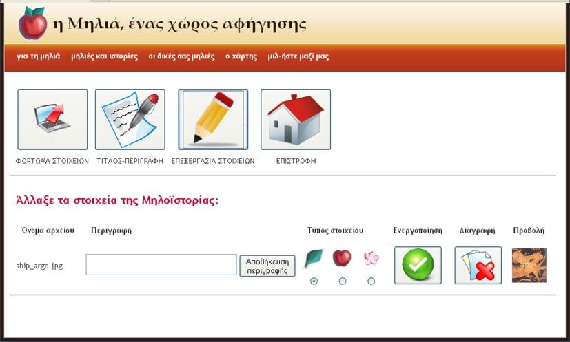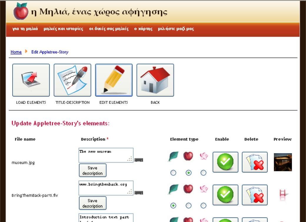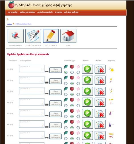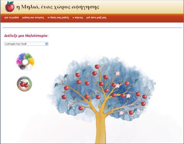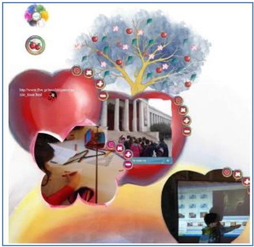 Figure 1 presents a representative welcome screen from the Milia online platform. Every apple tree holds a story, and the tree elements represent the story’s structure and contents. Figure 2 presents a representative snapshot of Milia tree elements, storing images and other multimedia content. All these elements can be uploaded and edited online through a graphical interface that allows users of the platform to operate as story creators. A sample screen from the Milia GUI is presented in Figure 3.