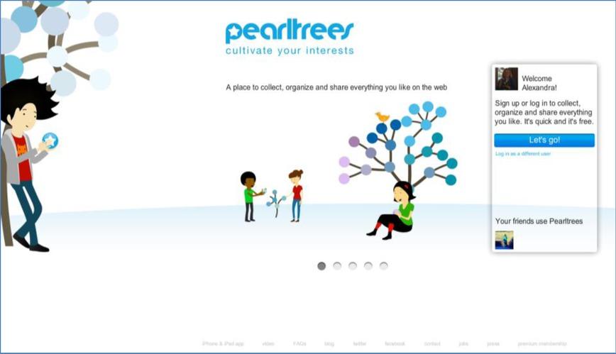 Pearltrees (http://www.pearltrees.com/) is a visual and collaborative content curation tool that allows users to collect, organize and share URLs. Users can drag and organize collected URLs into units called pearls. Pearltrees users can synchronise their social accounts with popular social networks such as Twitter and Facebook. A pearl represents a link to a web page; yet at the same time it is more than that, operating as an interactive object that users can move around their visual map. Users can share a pearl with others who “pearled” the same content and discuss it. What is especially intriguing is that users can view other users’ Pearltrees, which they can expand and explore at will. Pearltrees give meaning to the users’ interests and help to structure their web explorations. The tree structure helps by preserving a main theme of interests for each tree, whereas its branches can underline the sense of continuity with other similar themes.