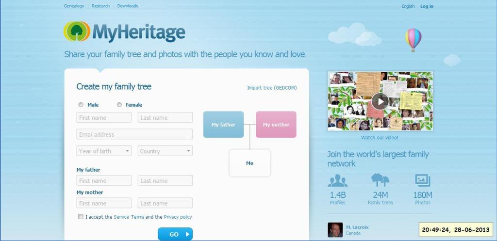 My Heritage (http://www.myheritage.com/) is a family-oriented social network service and genealogy website. It allows logged-in users to digitally create their own family tree websites. In this way, the traditional family tree can turn into an interactive experience where family members share pictures and videos, organise family events, create new family trees and search for their ancestors. The My Heritage platform has become quite popular, reaching some 72 million users, and it is currently one of the largest sites in the social networking and genealogy field. One of its most distinctive features is the capability to search for family history through facial-recognition technology.