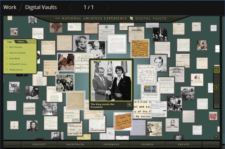 The Digital Vaults website (http://www.digitalvaults.org/) represents more than a digital display of photos, documents, videos and archives. It essentially provides a reading experience in a non-linear way while at the same time, similar to other digital platforms, it offers users the possibility of creating their own collections, games, posters and movies with the database material of the National Archives. Visual materials of the National Archives collections are displayed to users, and the interaction of the latter with information records enables new material coming forward, in this way implementing a surprising, informative and important form of storytelling. The Digital Vaults user experience is strongly reminiscent of the views of researchers like Michael Joyce (excerpt italicized for emphasis): “Narration takes place in the mind of the viewer, as an interpretation of the connections he makes throughout his digital storytelling experience” (Joyce, 1995). Each image contains historical information that can be added as captions. The movie-making tool includes soundtrack options as well as basic editing facilities. With a free login account, users can save their work, share it via hyperlinks or e-mail their projects. Web 2.0 technology allows users to search the database both by keywords and tags. Users can browse through the hundreds of photographs, documents and film clips and discover the connection between some of the National Archives' most treasured records. Digital Vaults represents an example of a constantly changing customary pattern of narration as stories are presented in an open-ended, branching, hyperlinked, cross-media, participatory, exploratory and unpredictable way (Alexander and Levine, 2008).