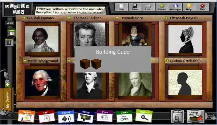 Museum Box (http://museumbox.e2bn.org/) is a tool for virtual displays of artifacts that someone can use online. Museum Box can help building up an argument or describing an event, person or historical period by placing items in a virtual box. Users can put on display text, files and movies, and the boxes created can be commented on by the other users. The choice between 3-dimensional cubes and 2-dimensional images allows users to change the viewers’ perception within a story.