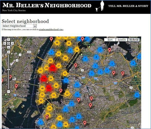 Mr. Beller’s Neighborhood website publishes reportage, personal essays as well as urban sketches. For the first five or so years of its operation, the front page of the site was based on a satellite photograph of a map of Manhattan and parts of Brooklyn that was divided into sections, each representing a neighborhood. Clicking on one of these sections allows users to zoom into the corresponding neighborhood, with red dots linking to articles about the location. In 2005, the platform started using Google Maps in colour, which can be zoomed into and out of more easily and is generally more flexible and user-friendly.