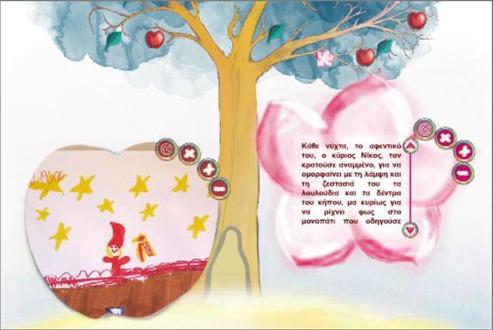 One more story that can serve as an example of what can be accomplished within a formal education setting with the Milia platform is “The Magic Apple Tree”. This third story is a more traditionally structured fairytale about a magic village of apple trees and a big dragon. The story was written for the 1st grade pupils of the 2nd Primary School of the Ano Liossia area, a low socio-economic status suburb region of Athens. The class consisted of 20 pupils with difficulty in Greek language due to their non-Greek (mostly Roma) origin.