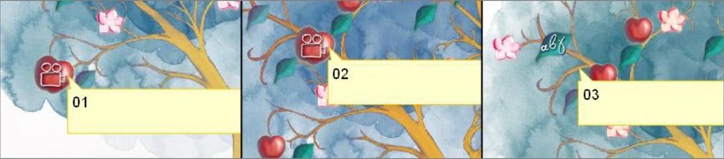 The Milia platform uses an apple tree as the space where story elements are placed. Elements can be of any media type (such as images, videos, sounds), but also text and hyperlinks. For every story element there is a corresponding tree element icon hanging from the apple tree as an apple, leaf or flower. Any combination is possible. For example, an AppleTree story may consist of sound leaves, image apples, text flowers etc. When a user clicks on a tree-element icon, the element expands and reveals the hidden content (Figure 13). Every element has control buttons in order to be moved, closed, zoomed in and zoomed out.