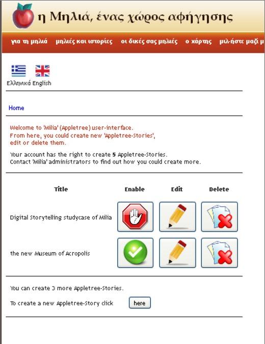 In order to become a storywriter, a user should register in the corresponding webpage of the Milia online platform. From the corresponding welcome screen (Figure 15), a writer may create new AppleTree stories, and also enable (making publicly visible), edit, delete or disable (making hidden from public view) existing ones.