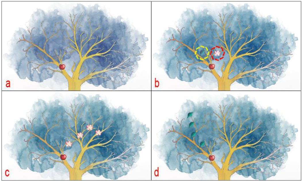In a future version, the Milia platform could respond dynamically to viewer’s choices. For example, in a linear story, only the first story element would be visible. When a visitor previews it that would trigger the appearance of the next element and so on. On top of that, in a nodal story there could be branching points (Figure 21a) where different paths could be proposed (Figure 21b) and the visitor could then decide which one to follow: by clicking the flower element, (Figure 21c) the flower path would be automatically revealed or by clicking the leaf element, (Figure 21d) the leaf path would be revealed.