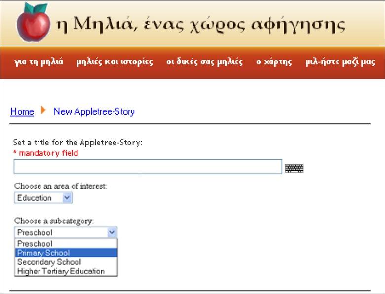 As the number of posted AppleTree stories grows (as of the time of writing, the Milia platform hosts more than 70 stories) there is the need for categorisation. Different levels of categorization can be envisaged, based on areas of interest (such as education, environment, culture), age range or socio-cultural profile of the audience that a story is addressed to (such as subcategories for Preschool, Primary School, Secondary School and Tertiary Education under a category for education). Writers could set the category of a story from the “New Appletree Story” screen (Figure 23) and metadata could be automatically generated, allowing visitors to filter available AppleTree stories per categories, using similar drop-down lists.