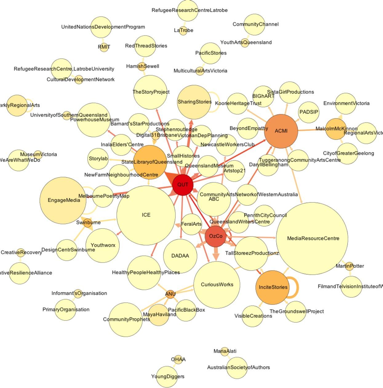 Figure 2 provides a network visualisation. This is an image which, while not attempting to map the territory, offers an aid to further exploration. The exercise was not a formal social network analysis of the CCM sector. Although we do visualise connections in the form of inter-organisational recognition (that is, where a research participant from one organisation mentioned the work of another organisation), exhaustively capturing all connections among all known CCM organisations in the country was not originally an objective of the project; it is an incidental data set.