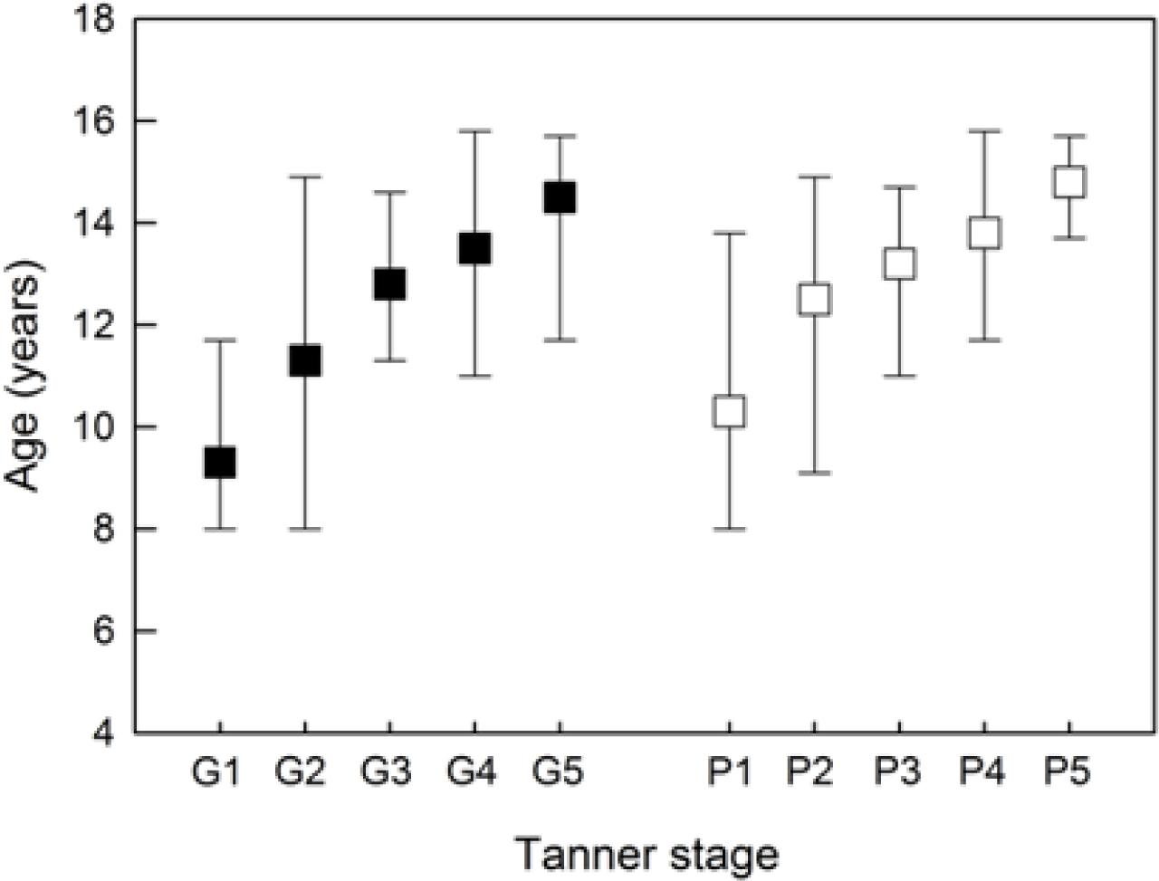 | Tanner stage | Number | Mean ± SD | Median | Range | 95%CI of mean age (years) |